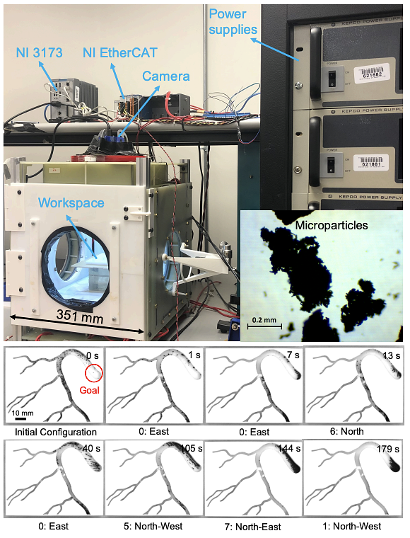 Gathering physical particles with a global magnetic field using reinforcement learning